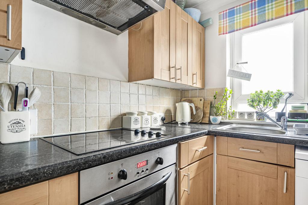 The kitchen is well planned with a good range of wall and base units, roll-edge work surfaces, and integrated cooking appliances, along with space for a fridge/freezer and washing machine.