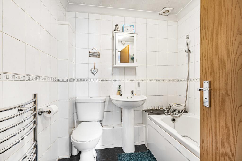 The bathroom is neatly finished with a panelled bath, electric shower and screen, pedestal basin, WC, heated towel rail, and tiled walls, combining practicality with a modern touch.