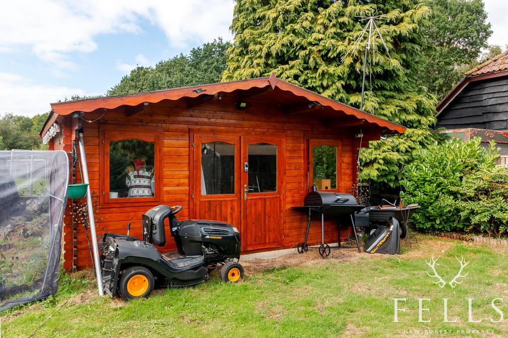 The garden extends the lifestyle appeal, with a patio enclosed by a low wall, ideal for outdoor dining beside the wood store. Beyond lies a wide stretch of lawn with mature shrub borders, a timber shed and a well-constructed chalet with power and lighting, making an excellent office or studio. The front of the property provides lawned garden space, shingle and driveway parking.