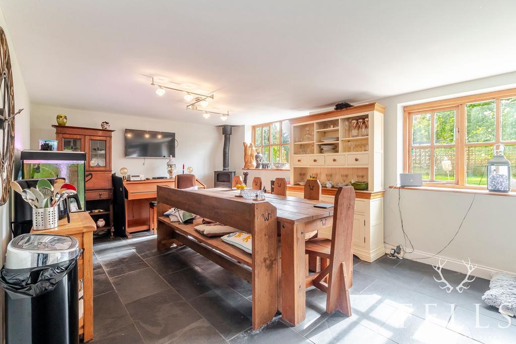 - Spacious L-shaped kitchen dining room with woodburning stove