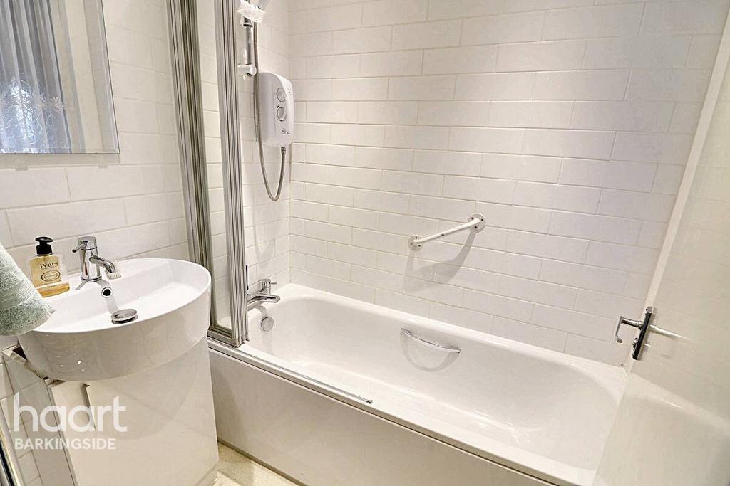Obscured double glazed window to front, tiled walls, vinyl floor covering, wall mounted towel radiator, wash basin, paneled bath with electric shower over and retractable shower screen, spot lighting.