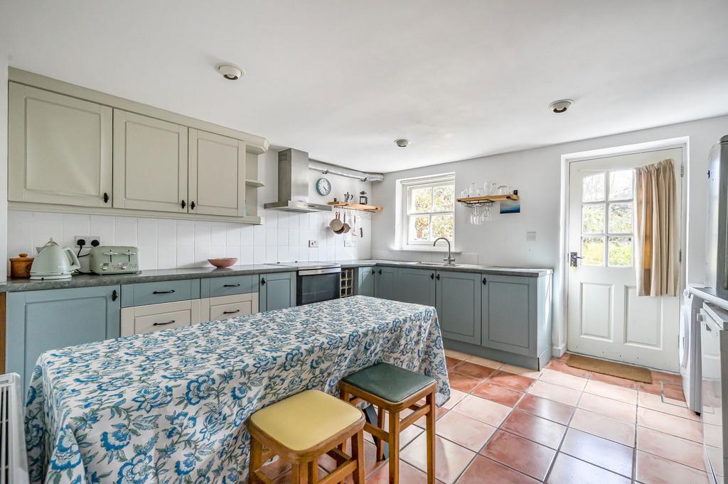 Range of base and wall units with laminate worktops, stainless steel sink and drainer and tiled splashbacks. Space and plumbing for laundry appliances and/or dishwasher. Space for cooker with extractor over. Timber sash window to rear garden and timber glazed door to garden. Tiled floor.
