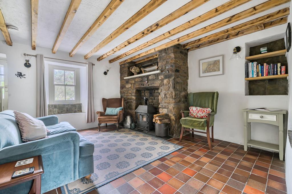 Timber sash window to front with slate window seat . Exposed beams. Multi-fuel stove in feature granite fireplace with alcove shelf over. Inset shelves to one side. Timber sash window through to kitchen with slate window seat. Understairs storage with light. Tiled floor.