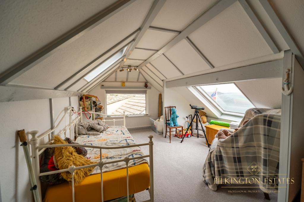 Accommodation includes a well-proportioned master bedroom, a second bedroom and modern family bathroom on the ground floor, together with a useful utility room. Upstairs, a spacious room which has been used as a bedroom/study with its own WC provides flexibility, ideal as a home office, guest suite, or creative retreat, boasting far reaching sea views. A large single garage on the ground floor completes the picture, equipped with an inspection pit, offering practical parking and storage.