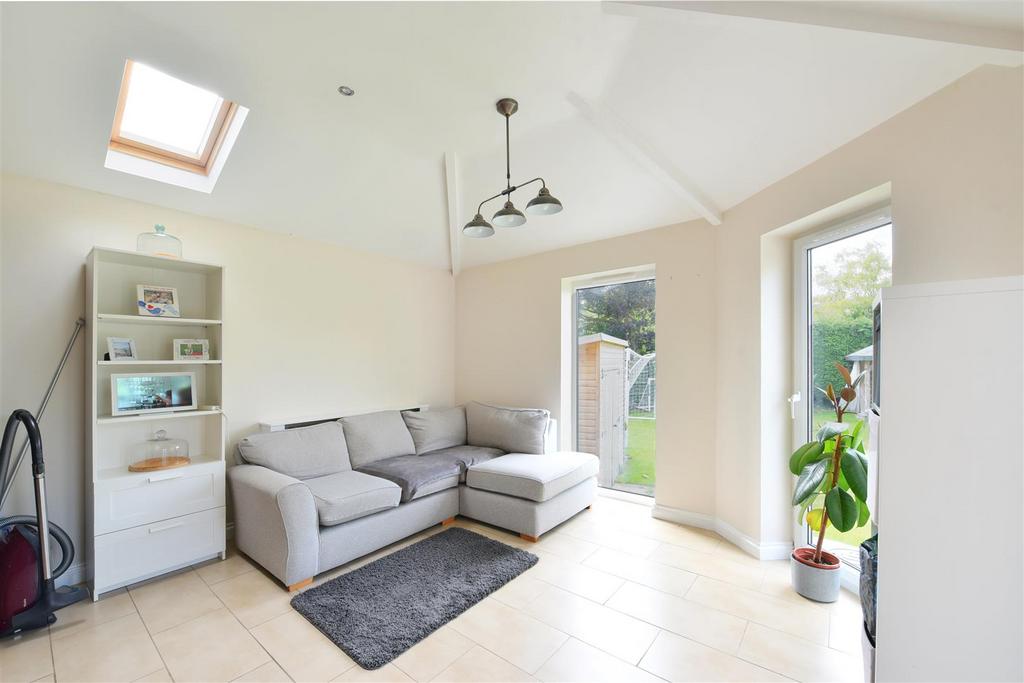 Kitchen - 7.67m max x 3.86m max (25'2 max x 12'8 max) - Modern fitted kitchen with a range of wall and base units complemented by co-ordinating work surfaces. Breakfast bar with seating. Inset sink unit with half bowl and drainer. Two integrated ovens. Ceramic hob with extractor hood over. Integrated dishwasher, fridge and freezer. UPVC French doors to garden. Two full height UPVC windows. Two skylights. Radiator. Underfloor heating.