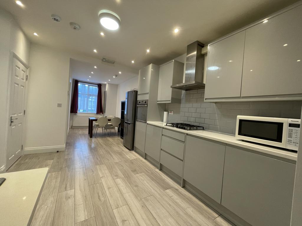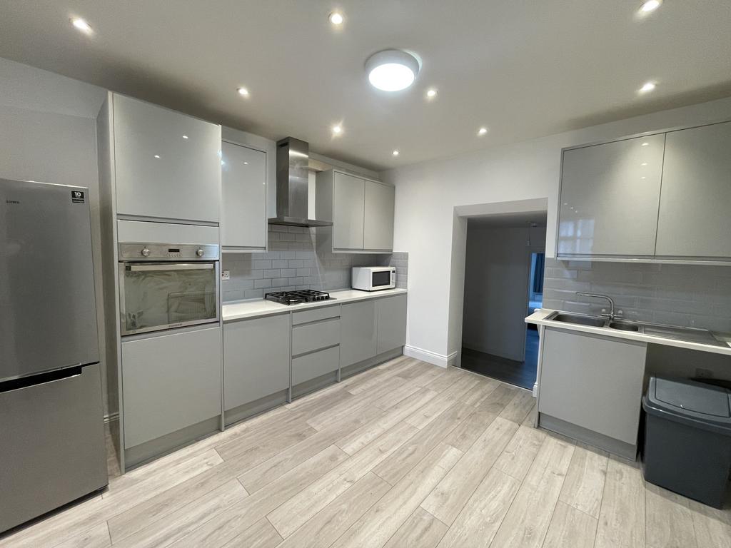 Grey wooden flooring throughout,Ceiling spotlights, c/h Radiators, Double glazed window overlooking the front aspect, modern kitchen units with Kenwood double oven,chimney style extractor hood above, 4 ring gas oven, integrated fridge freezer,microwave, sockets and power points