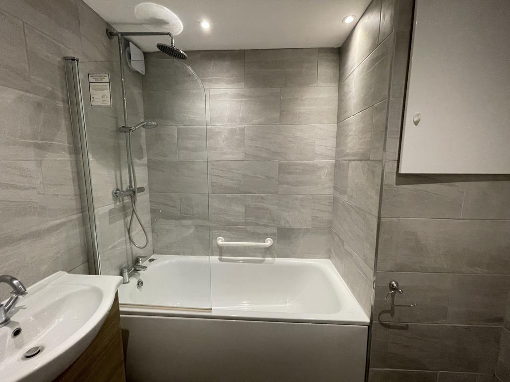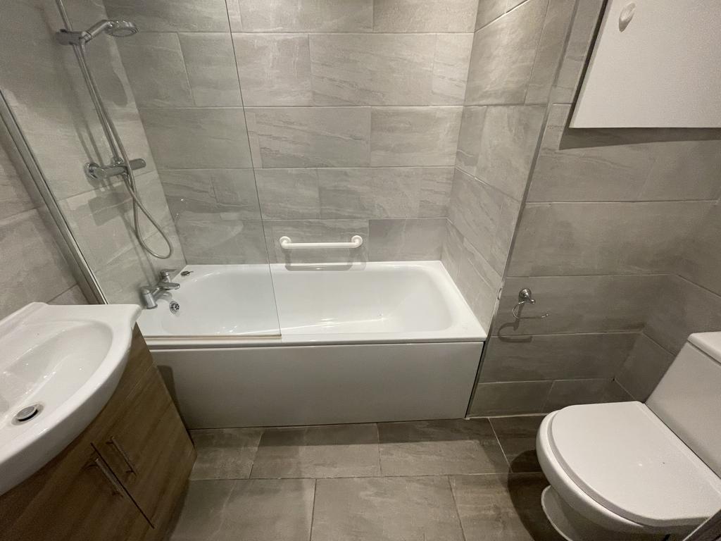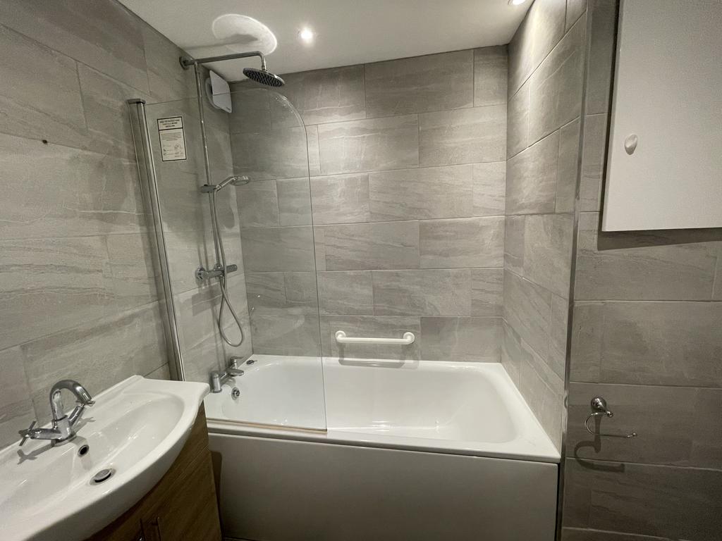 Modern 3 piece white bathroom suite, fully tiled throughout and power shower