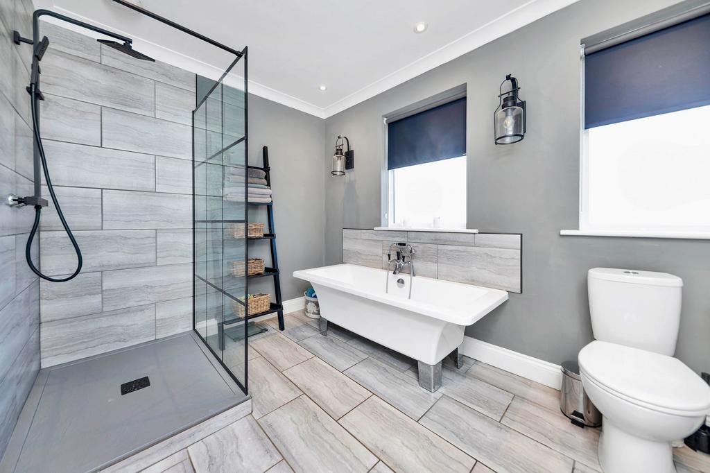 Stylish family bathroom fitted with bath, shower, WC and wash basin.