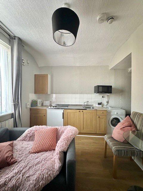 Fitted Kitchen with laminate flooring, access to shared rear yard and oak staircase