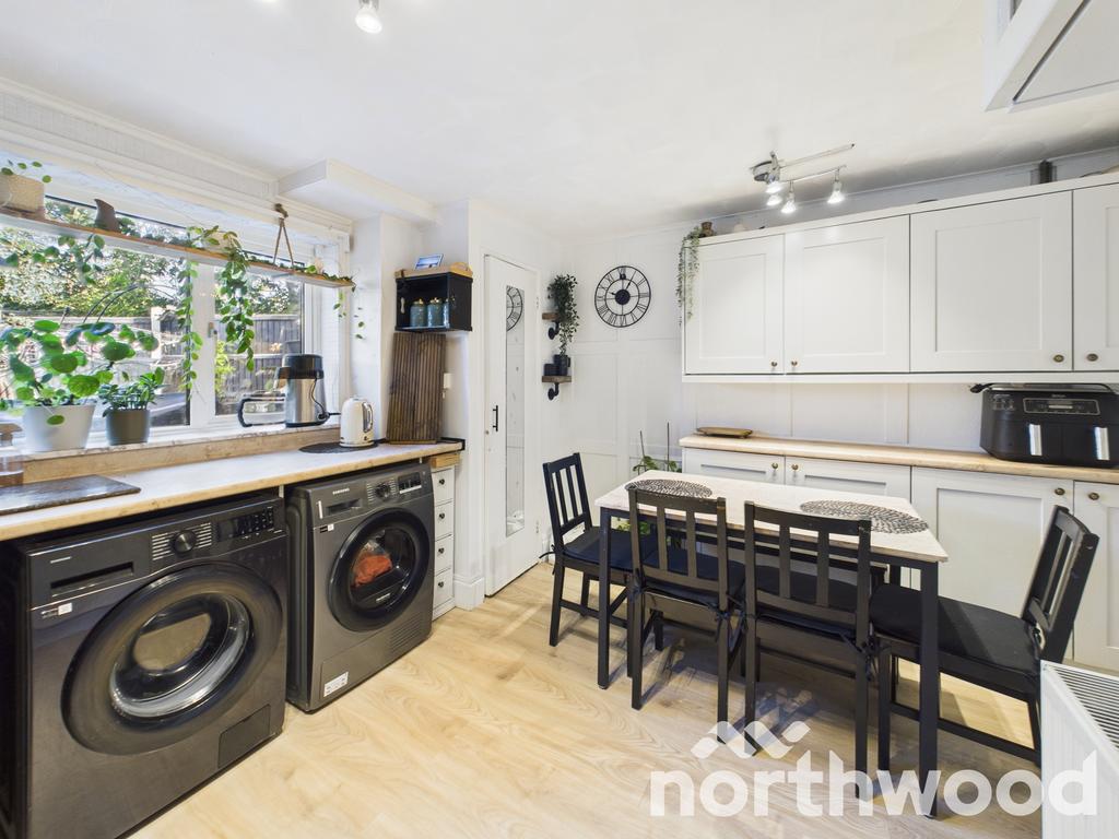 To the rear, the kitchen/dining room is a standout: modern, thoughtfully arranged, and designed for everyday living. Crisp white cabinetry pairs with contrasting hardware and wood-effect flooring to add warmth and balance. Integrated appliances include a built-in oven, with dedicated space for laundry. A large rear window frames garden views, while the dining area offers ample room for gatherings and casual meals.
