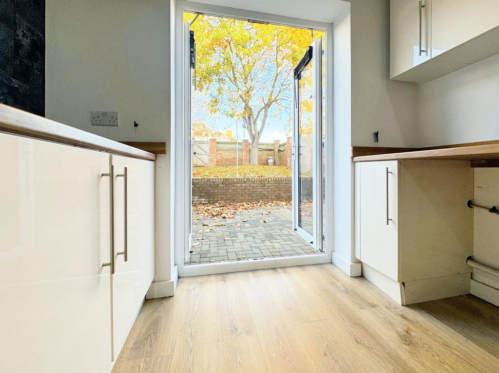 Modern kitchen/dining room with a range of lower and upper base units with contrasting work surfaces and matching upstands, plumbing for a washing machine, stainless sink unit and a breakfast bar. Laminate flooring, radiator and French doors leading to rear garden.