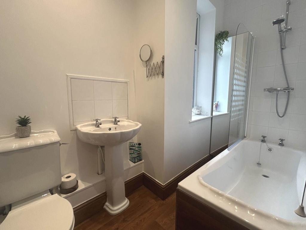With three piece suite, wall mounted shower with shower/bath screen, splash back tiling, heated towel rail and double glazed window to the side.
