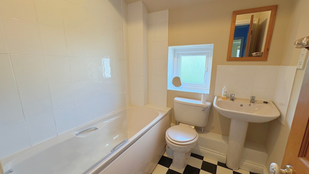 BATHROOM - Panelled bath with glass screen and shower. Low level WC. Radiator. Wash basin. Wood effect flooring.