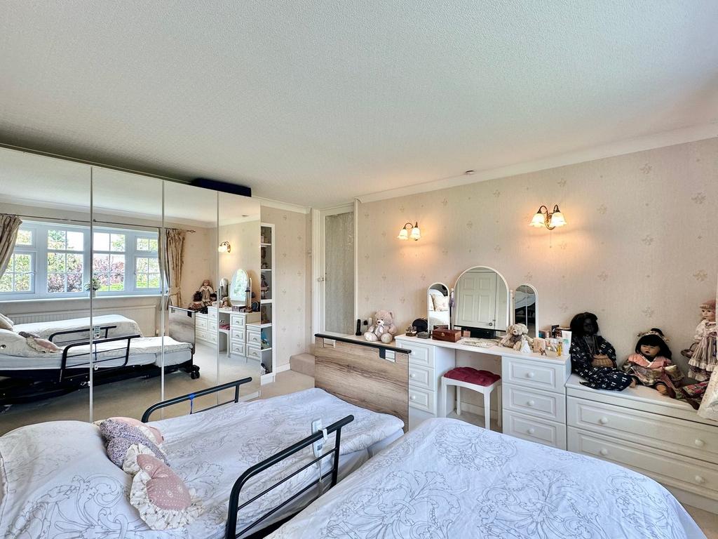 With continued carpet flooring from the reception hall, 2 wall light points, fitted storage to include large wardrobes and a chest of drawers, radiator, and double glazed window to the front elevation.
