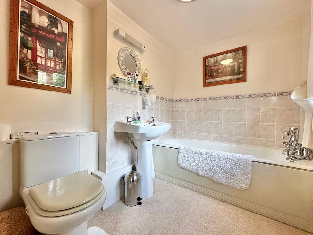 With carpet flooring, ceiling light point, wall light point with shaver point, double glazed obscured glass window to the side elevation overlooking the drive, radiator, wash hand basin with chrome hot and cold tap over, low level WC, and bath with chrome mixer tap and shower attachment over.