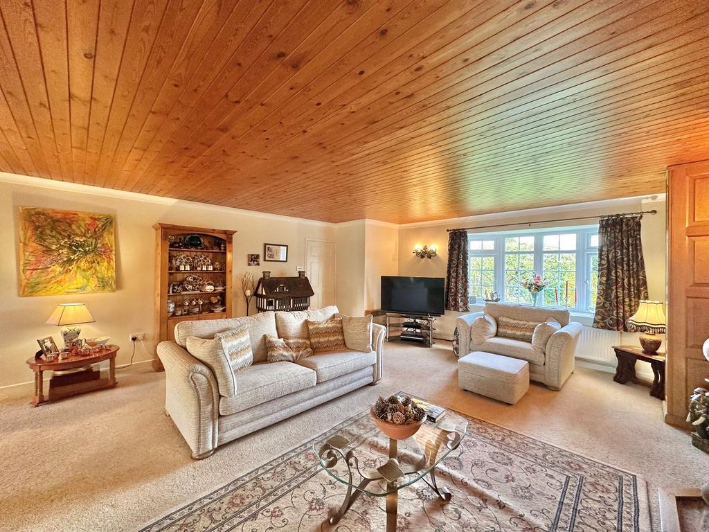 A very large lounge comprising carpet flooring, multiple wall light points, ample power points, telephone point, oak feature panelling, pine above, double glazed window to the front elevation, feature chimney breast with electric fire, 2 large radiators, and double glazed sliding patio door leading to conservatory.