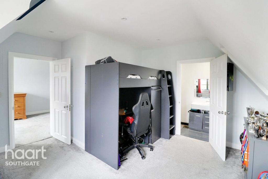 A bright and well-proportioned double bedroom with a front-facing window , filling the room with natural light. Finished with carpet flooring, this room also enjoys the benefit of its own en-suite shower room, making it ideal as a private guest suite or family bedroom.