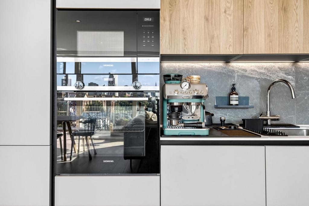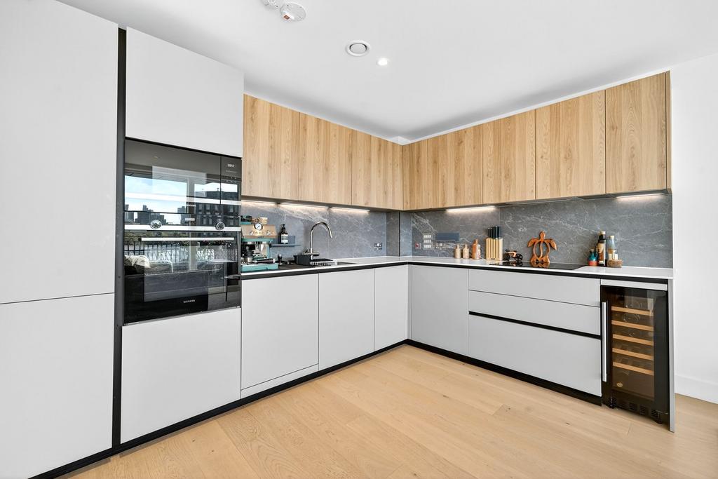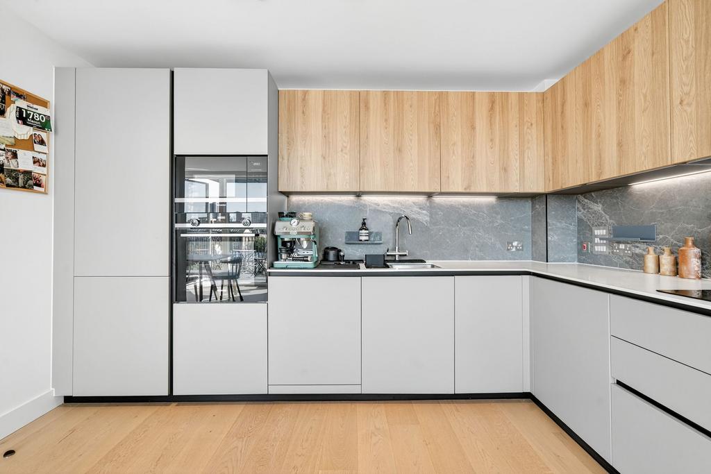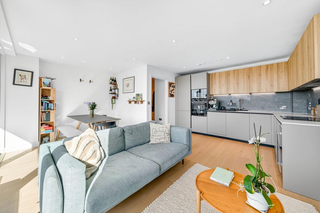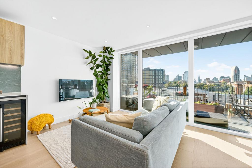 Flooded with natural light, the apartment benefits from a southerly aspect and floor-to-ceiling windows, framing far-reaching views of the City. The open-plan layout has been thoughtfully designed to provide defined areas for cooking, dining and relaxing, making it an excellent space for both everyday living and entertaining. The double bedroom also enjoys impressive City views, while the property is completed with a sleek modern bathroom, generous storage, and a private balcony.