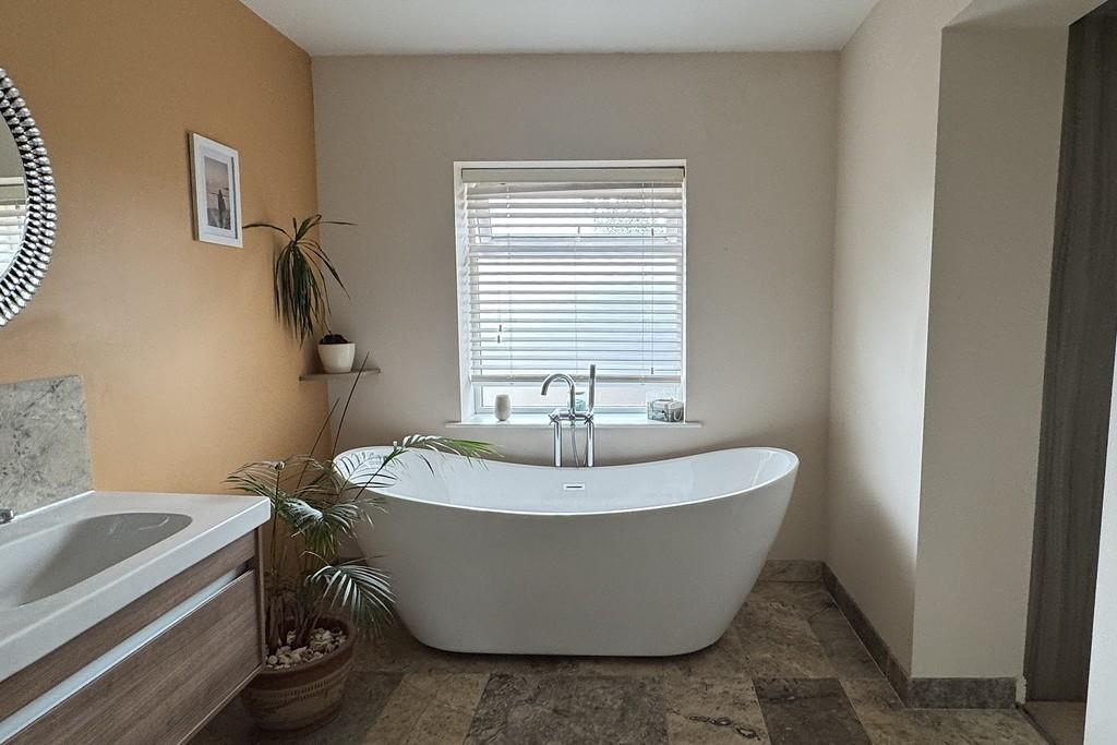 ENSUITE 7' 8" x 12' 9" (2.35m x 3.89m) This luxurious ensuite comprises of a free standing bath tub for long soaks, a walk-in double shower cubicle for a morning refresher, vanity unit wash hand basin, heated towel rail and a close coupled, dual flush WC. Obscure glazed window for privacy with a fitted venetian blind, LED lighting, Travertine tiled splash areas and flooring with electric heating underfoot for year round comfort.