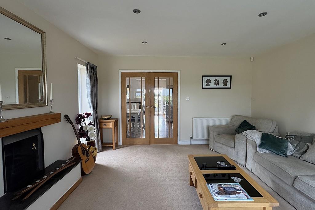 DINING ROOM 11' 10" x 13' 5" (3.62m x 4.10m) Having a large walk-in bay window framing picturesque views across the garden and paddock, an ideal backdrop for relaxed meals or lively gatherings. A multi-fuel log burning stove with a beam mantle and tiled hearth, radiator and fitted storage cupboards. Engineered oak flooring continues seamlessly into the open-plan kitchen, tying the spaces together.