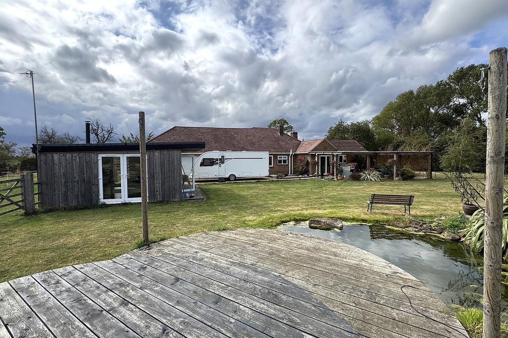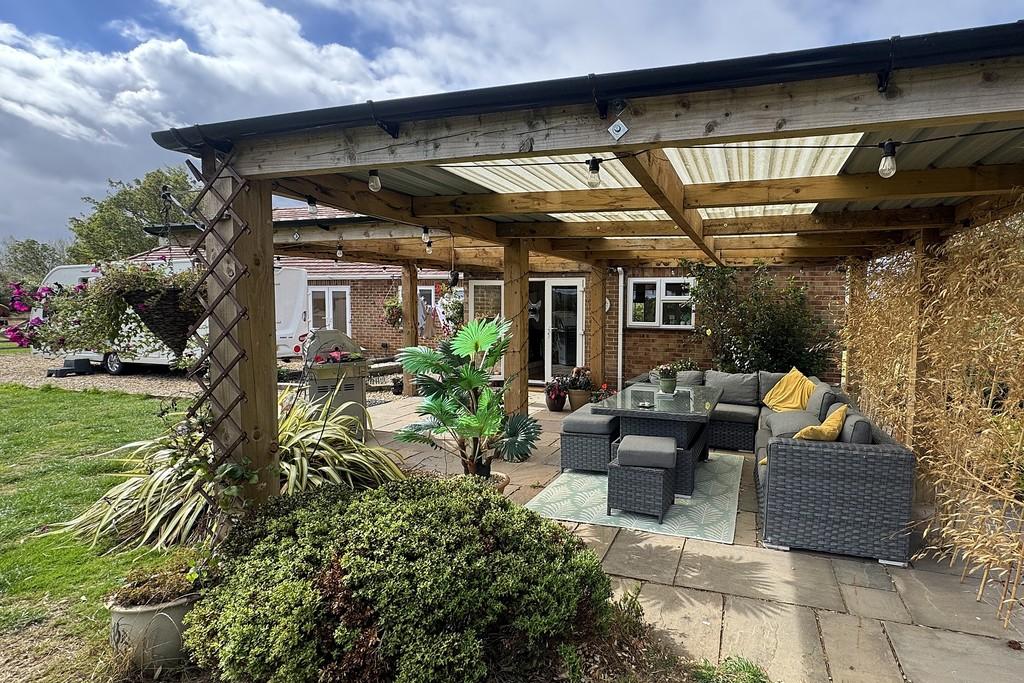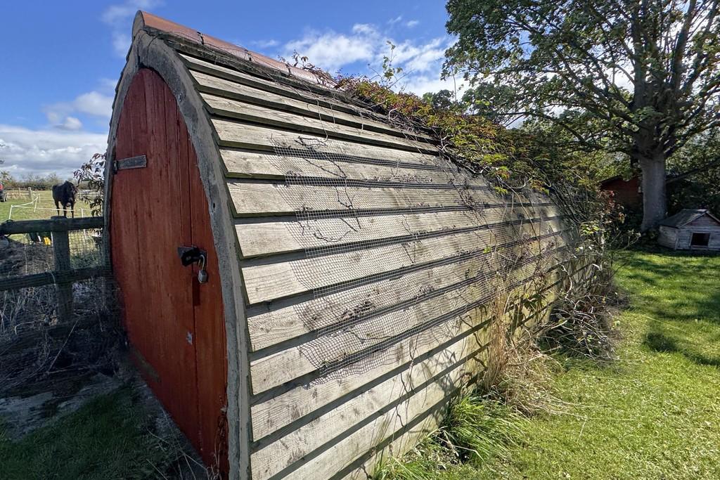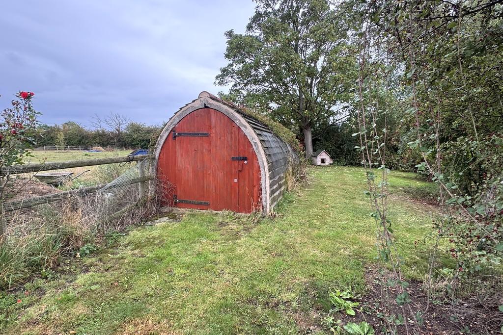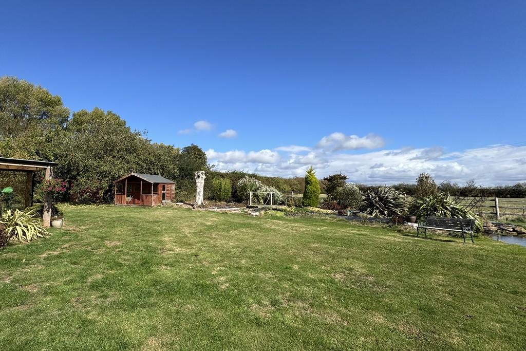 GARDENS Extensive gardens envelop the property with sensory courtesy lighting and both front and rear outside taps and electrical sockets. Having a generous gravel driveway providing off road parking and a gravel area to the rear for secure caravan storage. A covered patio seating area provides a great space to entertain and enjoy summer barbeques. Throughout the lawned grounds are many fruit trees, mature shrubs and trees and an ornamental pond with a decked seating area. A Nissen hut provides handy storage with power connected. Post and rail fencing with five bar gates secures the two grassed paddock areas.