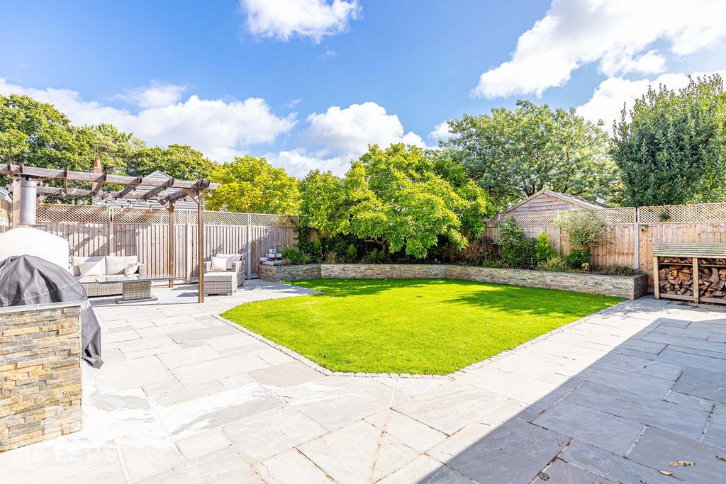 To the rear, the property boasts a private, low-maintenance garden designed for entertaining and outdoor living, enclosed by fencing with trellis panels for added privacy and an attractive finish. A large, paved patio spans the rear of the property, extending to a corner seating area beneath a timber-framed pergola. While a bespoke brick-built outdoor kitchen forms the focal point of the garden, featuring a pizza oven and built-in BBQ, perfect for alfresco dining. A raised plant bed constructed in matching brickwork continues the style and along with the lush level lawn adds greenery to the space.