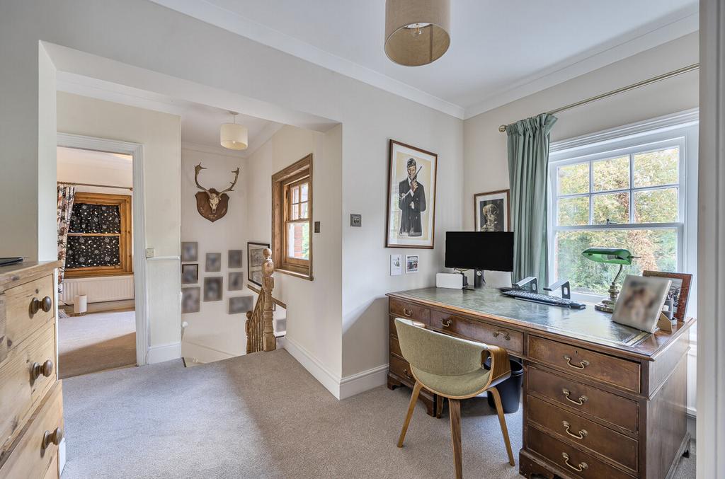The first-floor landing leads to five bedrooms, with a family bathroom. Of particular note is the recently refurbished master suite, which combines newly fitted wooden floors, a sumptuous en-suite with double shower and bath, and a particularly well-crafted walk-in wardrobe.