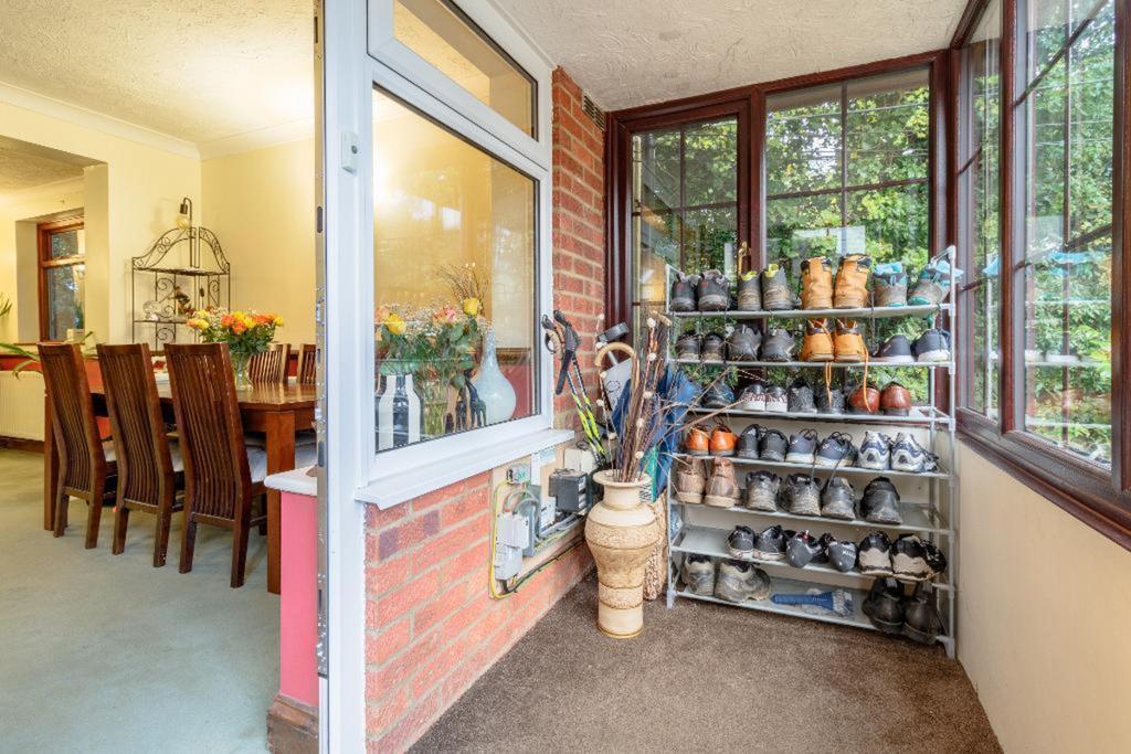 The generous rear garden features mature trees, shrubs, a large lawn, and several outbuildings, including a self-contained office—perfect for working from home. There is also a poultry pen, offering the chance to enjoy a smallholding lifestyle.