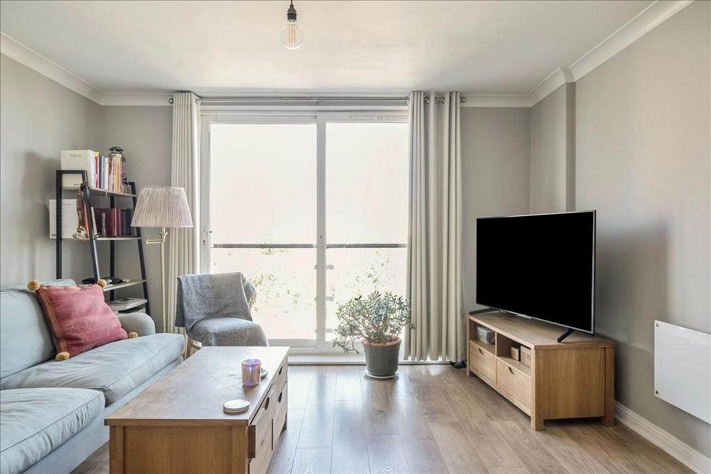 LIVING ROOM: 14.1 x 12.1 (4.29 x 3.68m), Double glazed sliding doors to Juliet balcony, wood laminate floor, electric WIFI enabled radiator, TV aerial point, opening to: