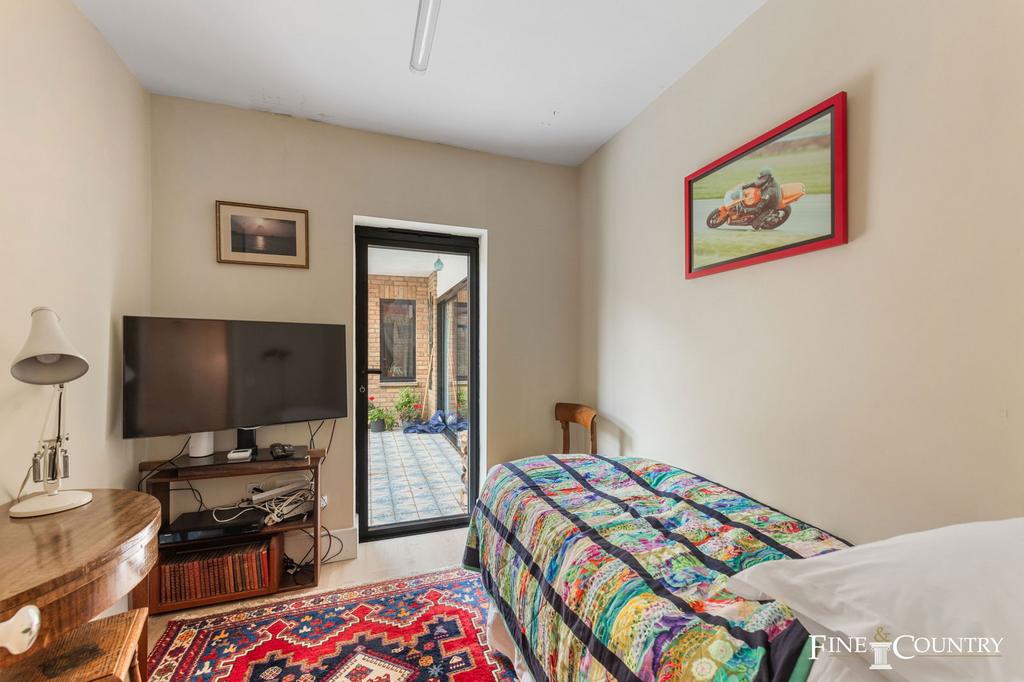 The kitchen flows seamlessly into the dining room, where bi-fold doors open out onto a sun-drenched, south-facing Mediterranean courtyard. Perfect for entertaining, this intimate space invites long al fresco lunches and convivial evenings under the stars.
