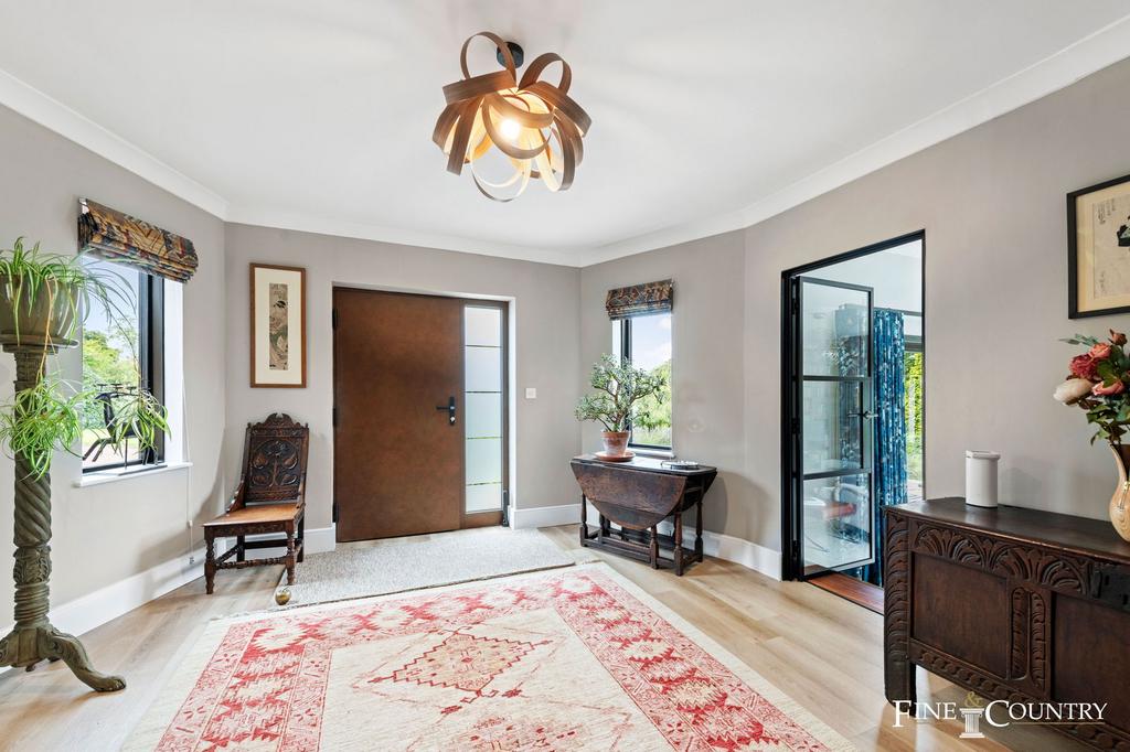 The house itself has been the subject of an extensive and thoughtful renovation, blending architectural integrity with cutting-edge design. Expansive aluminium triple-glazed windows ensure light floods every room and frame striking views of the gardens from every angle. Internal Crittall-style doors create a sense of flow and cohesion, while the entrance hall sets a tone of understated grandeur, with its light, airy proportions and striking Spitfire designer front door in Corten steel—a contemporary statement in style and security.
