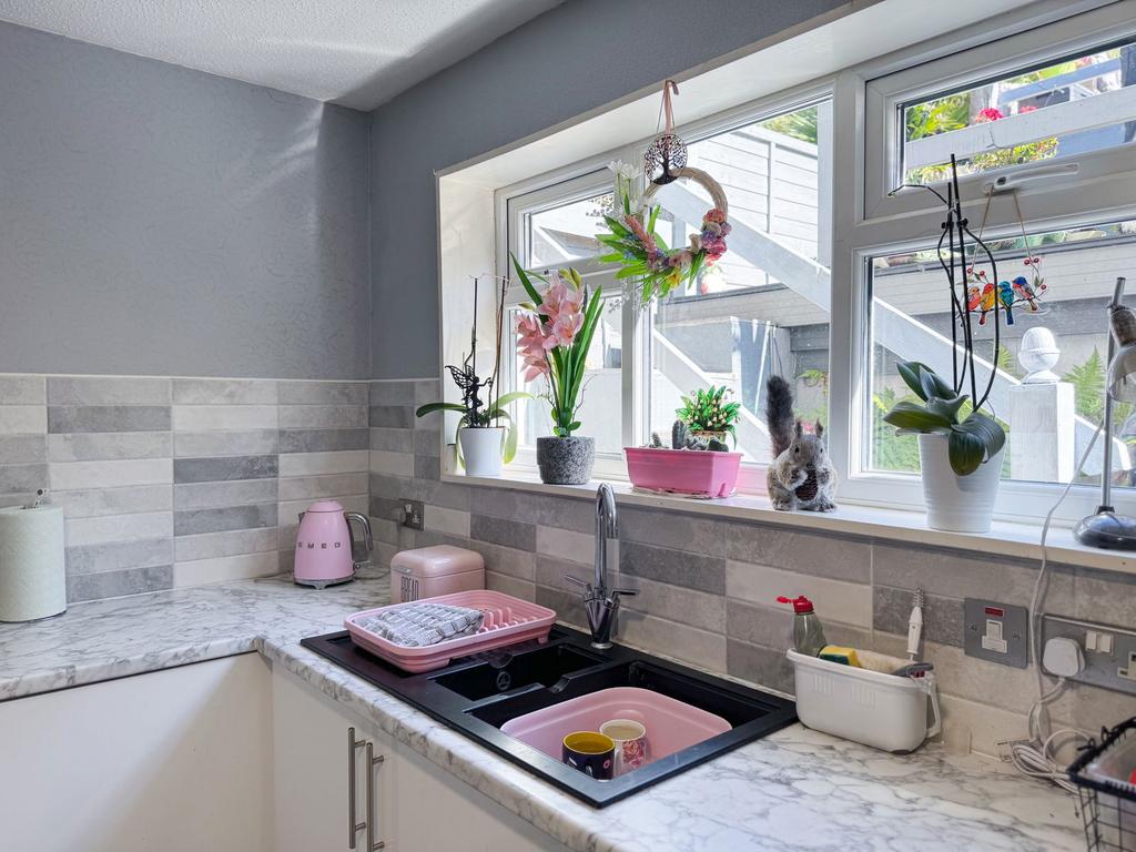 The kitchen/diner has been modernised to a high standard, featuring sleek white cabinetry complemented by a white and grey, square-edged marble-effect worktop and a matching grey tiled splash back. The kitchen is equipped with an eye-level oven and an electric hob, offering both style and practicality for everyday cooking and entertaining.