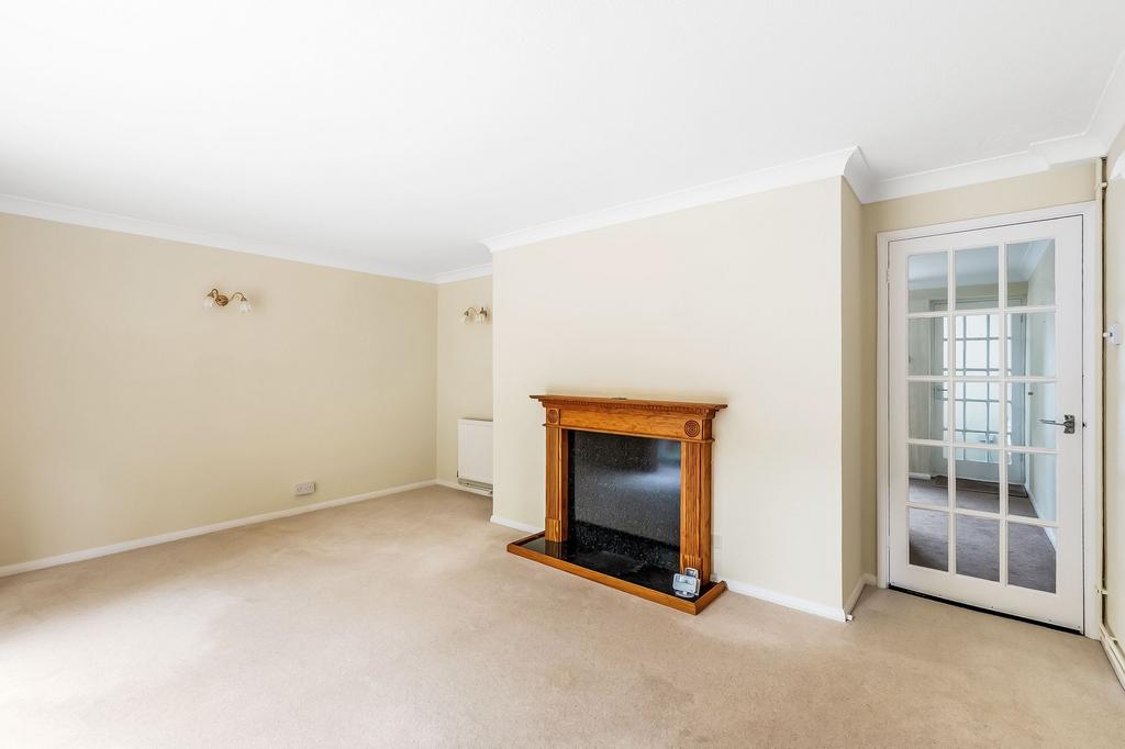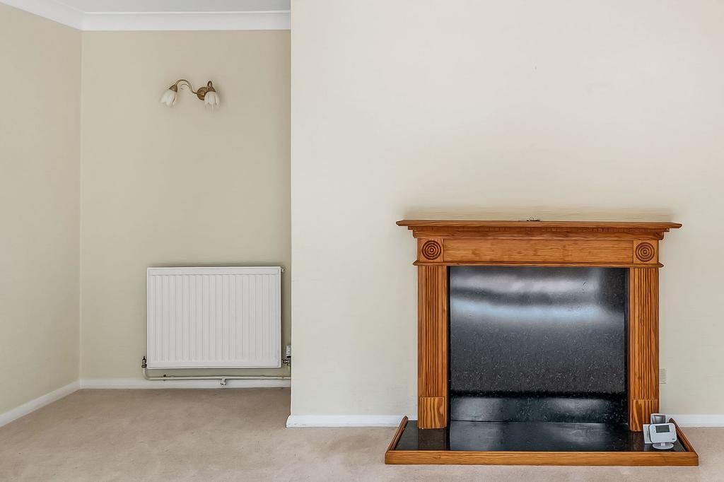 A bright dining room with a large front window creates a warm and airy space for family meals or entertaining. The adjoining kitchen is well presented with generous storage and practical worktop space. To the rear, the light-filled living room is a standout feature, with sliding doors opening onto the patio and a central fireplace creating a cosy focal point.