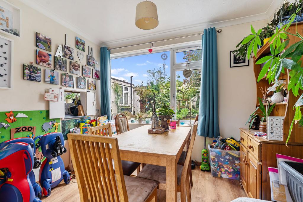 A superb light dual aspect room with feature woodburning stove, double glazed windows to front and rear, ample dining space.