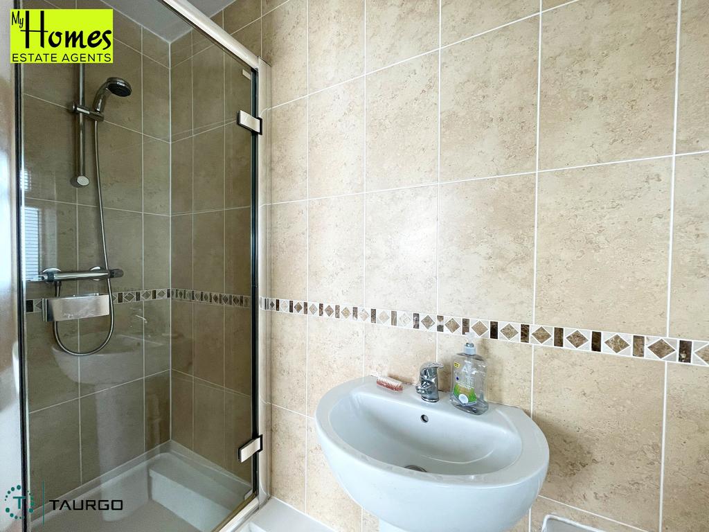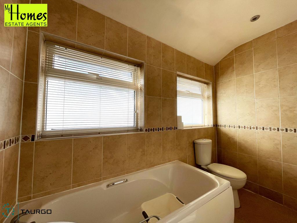 Large family bathroom comprising low level WC, wash basin and full size bath. separate shower cubical. tiled from top to bottom nice finish