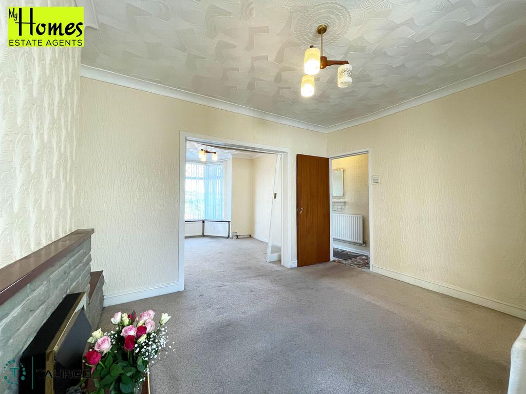 via a UPVC doorway into the pouch and hallway, then leading to first living area with stone feature fire place, through to the second living space large window allowing natural light to flood in, magnolia walls and beige carpet, artex ceilings
