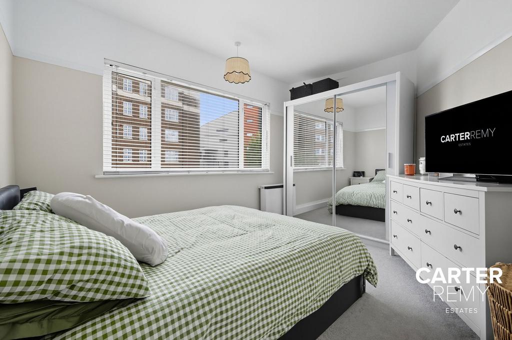 The bedroom is a calm, roomy retreat where space for a double bed, storage and a dressing area preserves a sense of order and rest. Windows frame a distant shimmer of sea so mornings arrive with light and a gentle horizon. The bathroom is tidy and functional, consistent with the apartment’s understated and refined character.