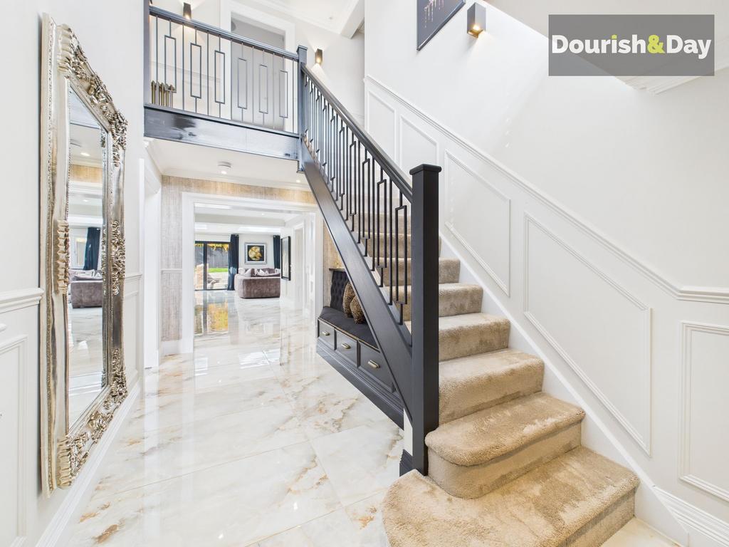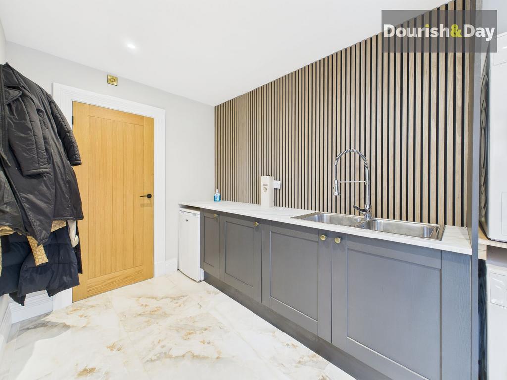 The home has been completely refurbished throughout with no detail overlooked which includes underfloor heating throughout the ground floor accommodation. From the sleek finishes and contemporary styling to the integrated speaker system in every room, every element has been designed with comfort and quality in mind. A striking entrance hallway sets the scene, leading into a spacious living room and an incredible open-plan kitchen, dining and living space. The kitchen is fitted to the highest standard with a central island, granite worktops and a range of integrated appliances. Skylights and bi-fold doors fill the room with natural light, while the living area is centred around a bespoke media wall. The ground floor also features a utility room, guest WC and a dedicated office or study – ideal for those working from home.
