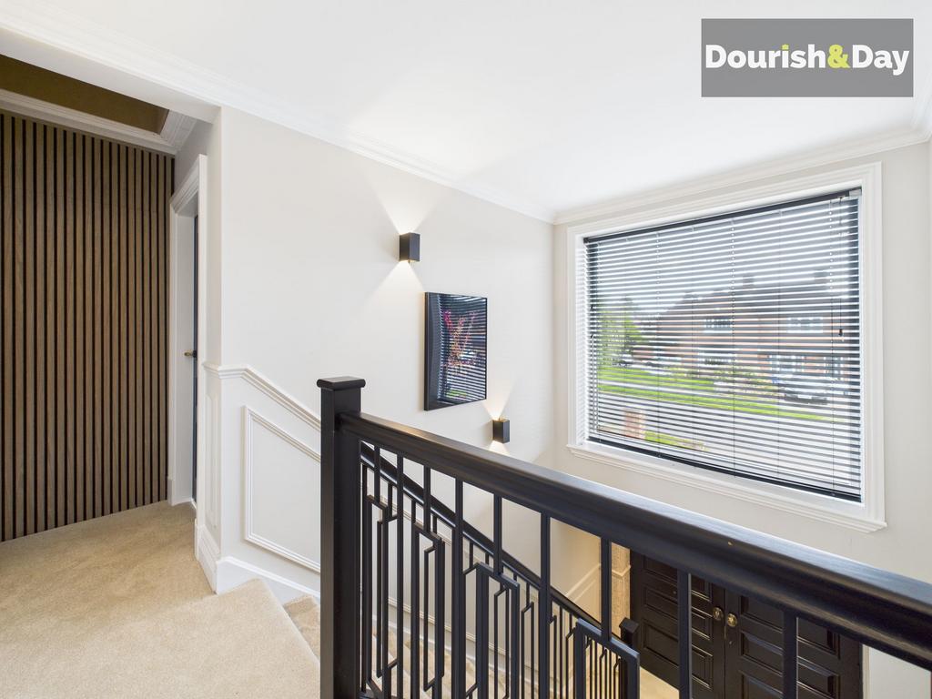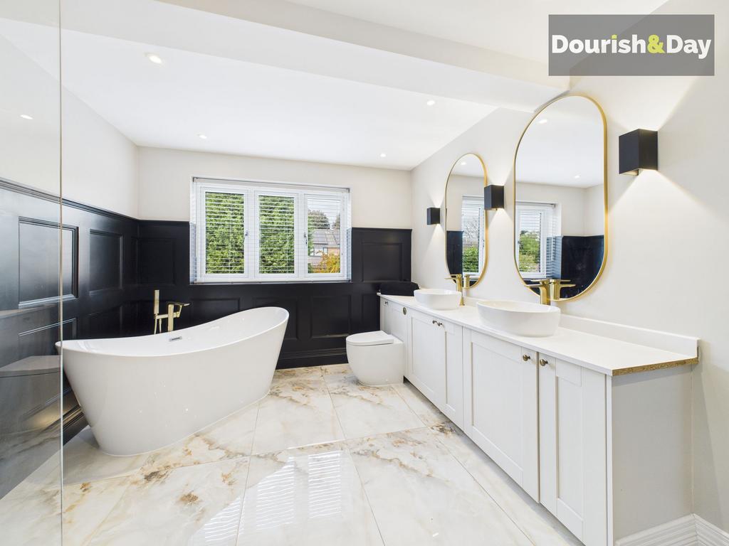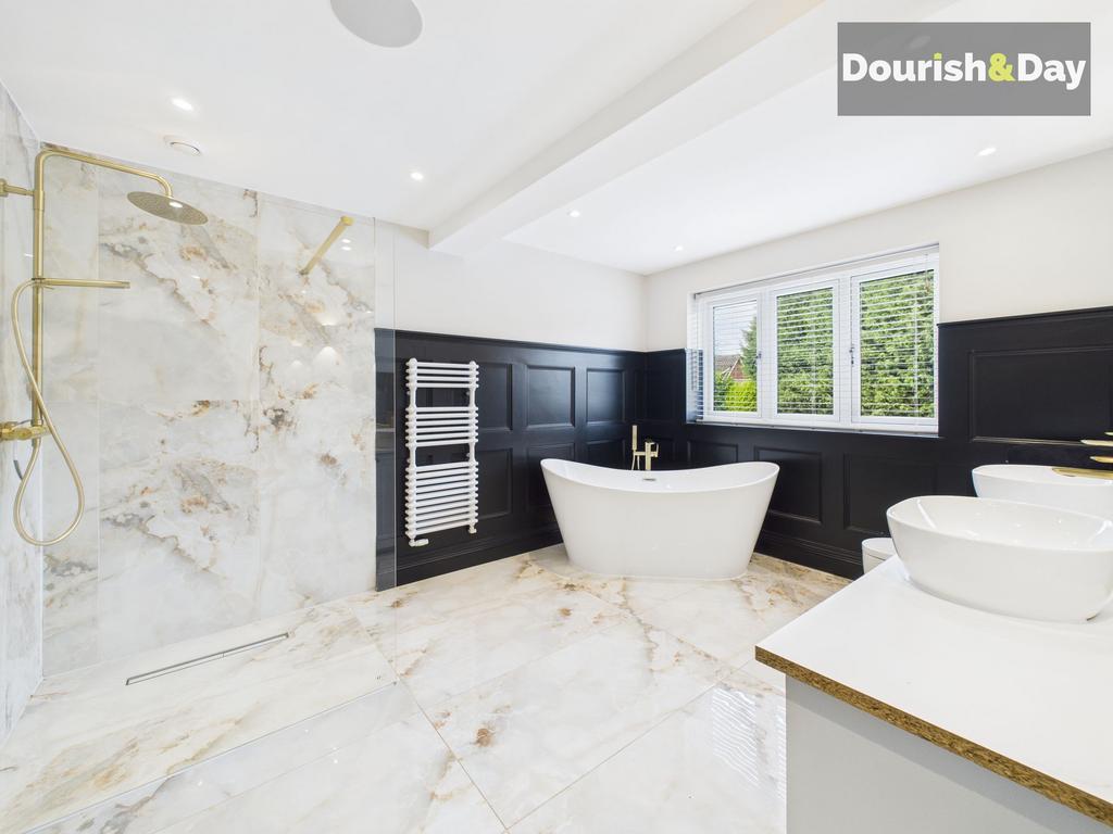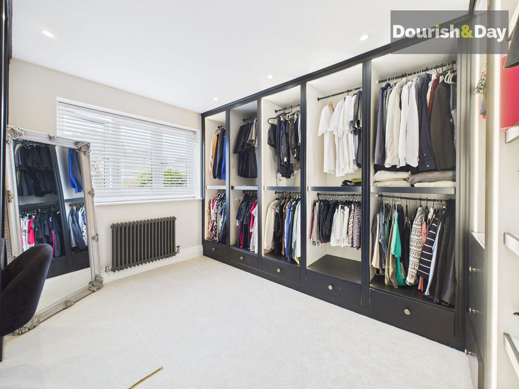 Upstairs, the sense of style and space continues. The landing is a real feature, with a large central window flooding the space with light, alongside a cleverly designed secret storage cupboard. There are four double bedrooms, one currently used as a walk-in wardrobe, a contemporary family bathroom that doubles as an ensuite with a freestanding bath and separate shower cubicle, plus an additional ensuite shower room.