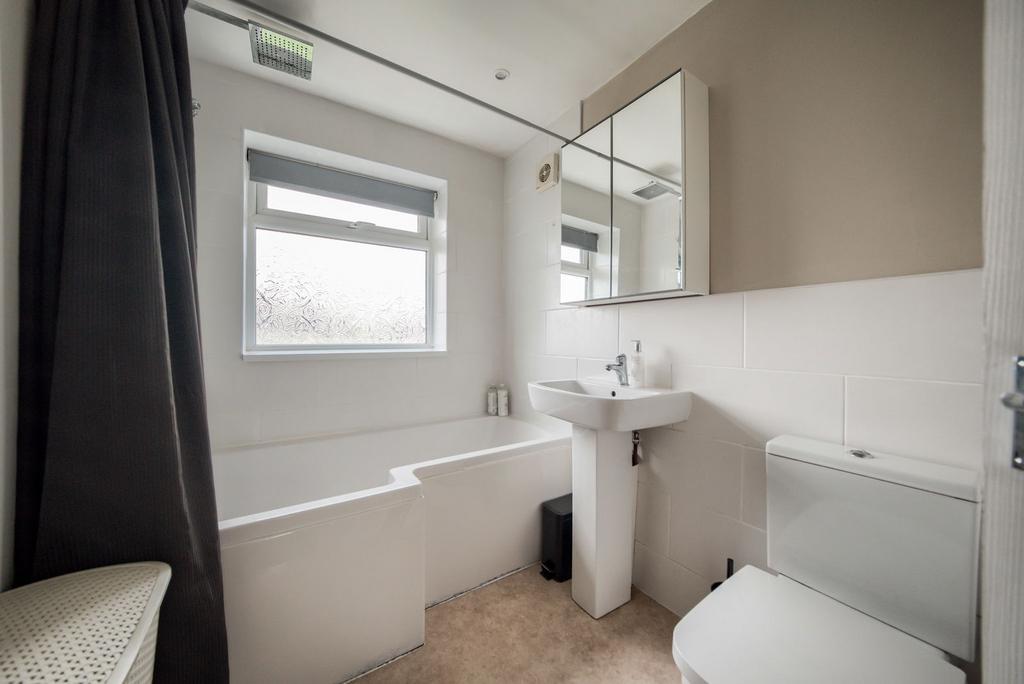 Fitted with a whites suite comprising of 'P' shaped bath with shower over, pedestal wash hand basin and low flush w.c. Tiling to splash back, spot lighting to the ceiling, central heating radiator and UPVC double glazed window over looking the rear aspect.