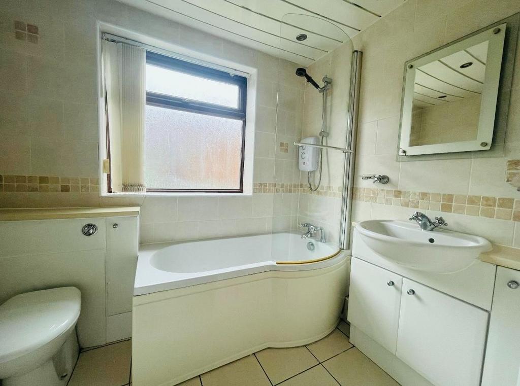 Bathroom: White suite comprising panelled bath with shower over, low level WC, vanity wash hand basin, tiled walls, tiled floor, spotlights.