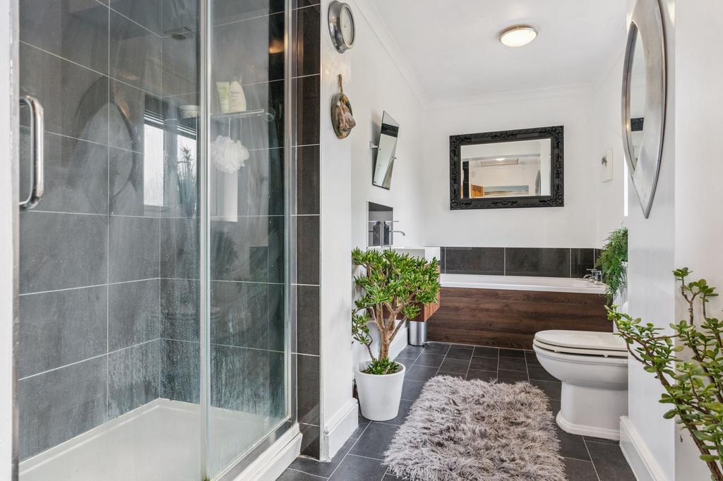 Serving the additional bedrooms and completing the first-floor accommodation is a beautifully appointed family bathroom. Contemporary in design, it features a low-level W.C., wall-mounted wash hand basin with storage beneath, a separate shower cubicle, and a panelled bath—offering both practicality for everyday family life and a touch of luxury for relaxation and unwinding.