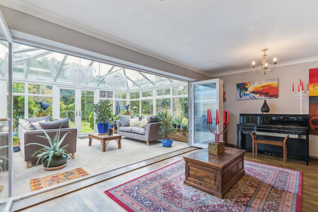 Upon entry, a welcoming hall complete with a downstairs cloakroom introduces the home and opens into the magnificent formal sitting room, an impressive space extending over 32 ft. in length. To the front, the sitting room is centred around a charming log burning stove, offering a warm and inviting atmosphere for everyday relaxation, while its scale makes it equally well suited to entertaining family and friends, or simply unwinding with family to enjoy a movie. To the rear, bi-folding doors lead seamlessly into a bright conservatory, perfectly positioned to enjoy uninterrupted views of the private rear garden.