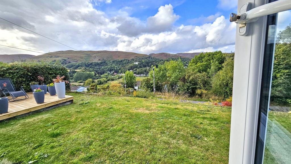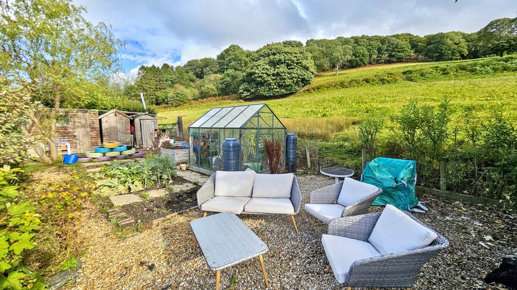 GARDEN Consists of large decking area leading to a semi-covered patio. Steps up to the lawned areas. Beyond this a kitchen garden area with sheds, green house and another gravel seating area.