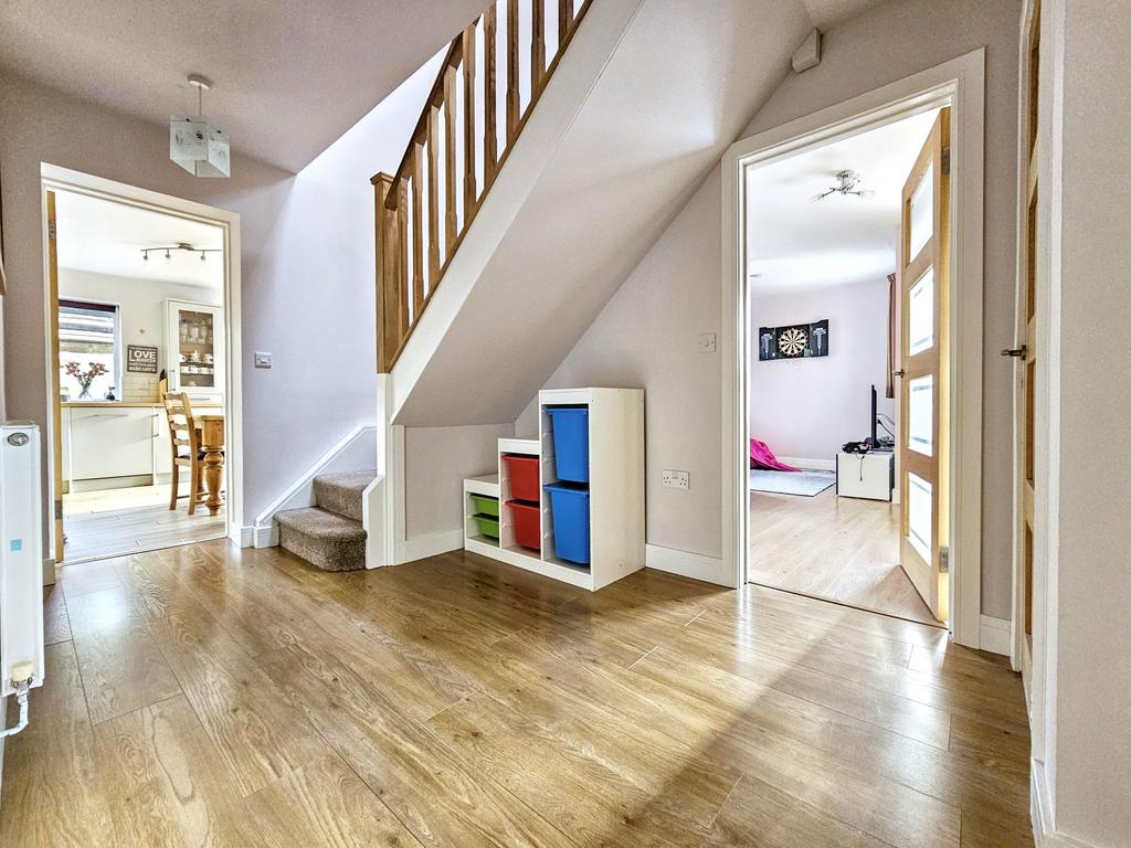 Large RECEPTION HALL with wood effect laminate floor, radiator, four power points, cloaks cupboard with light and STAIRCASE with fitted carpet ascending to the first floor.