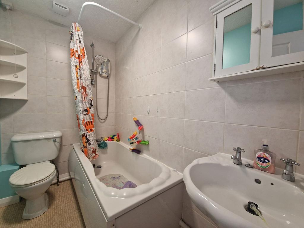 BATHROOM/WC: Comprising bath with Mira shower unit over, shower curtain and rail, pedestal wash hand basin, WC, heated towel rail, tiling to splash prone areas, ceiling extractor fan, medicine cabinet.