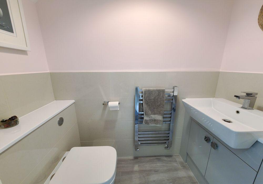 The cloakroom has been tastefully refitted with a modern suite including a low-level WC, vanity unit with inset wash basin, heated towel rail, part-tiled walls and tiled flooring.