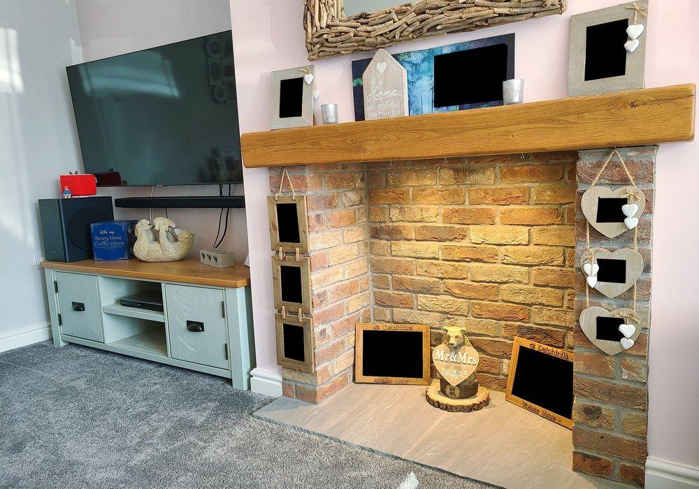 The lounge is positioned to the front aspect and offers a comfortable and stylish living space with smooth ceiling, downlights, and a large double-glazed window. A feature ornamental brick fireplace with concealed lighting and tiled hearth forms the centrepiece, with a capped gas point in place should buyers wish to reinstate a fire.