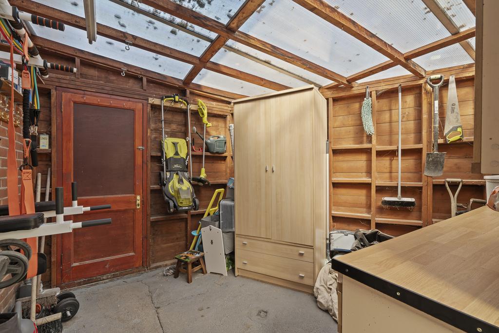 The sunny rear garden offers space for children to play, summer barbecues, or simply relaxing with a book. Theres also a useful lean-to, providing excellent storage, space and plumbing for appliances, and the convenience of an outdoor WC.