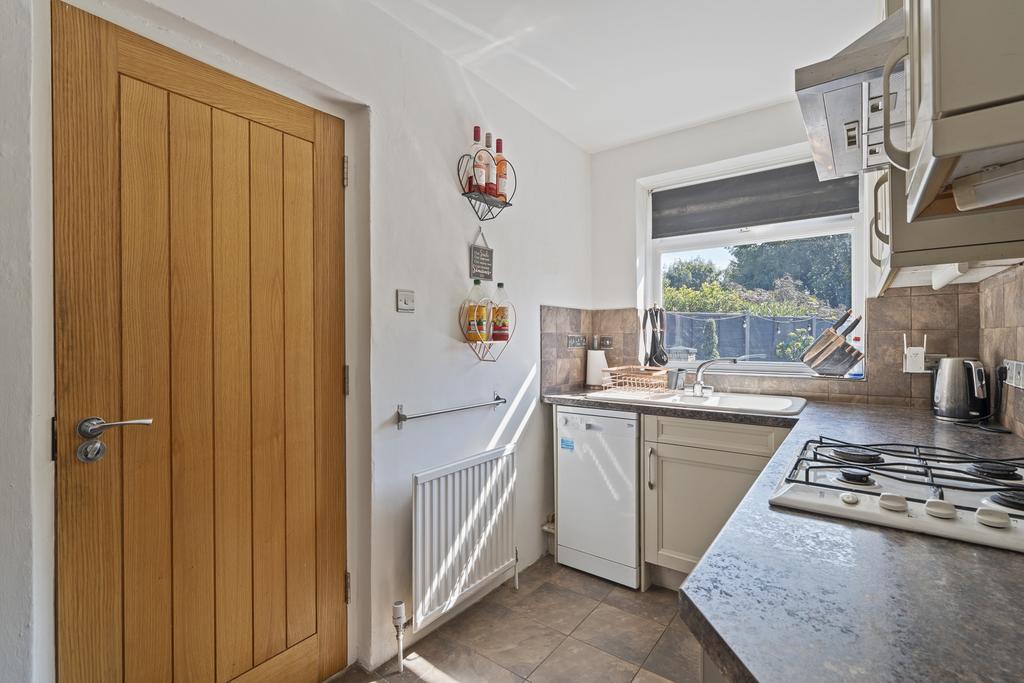 Double glazed window to rear. Tiled floor. Matching wall and base units. Ample work surfaces. Tiled splash backs. Integrated electric oven. Four point gas burner hob. Stainless steel extractor hood. Radiator. Space for fridge freezer. Freestanding dishwasher. Doorway leading to lean-to.